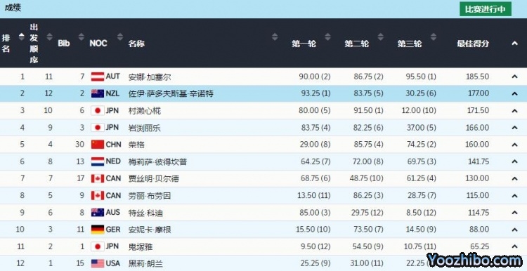 最后一位选手来自新西兰的佐伊·萨多夫斯基·辛诺特,落地有些失误,佐伊最终得到177.00排名第二。