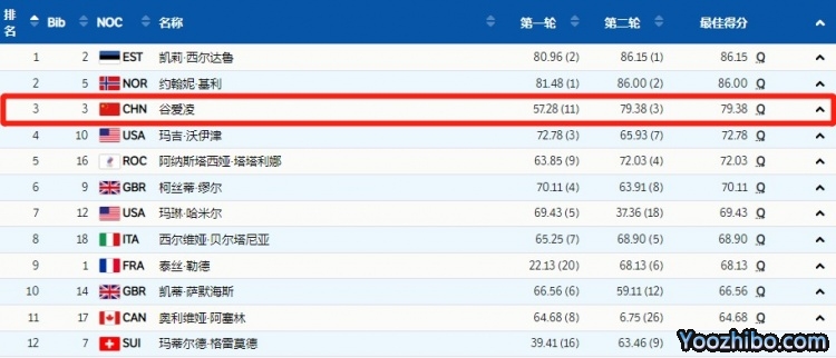 直播车讯北京时间2月14日,冬奥会自由式滑雪女子坡面障碍技巧资格赛,中国选手谷爱凌和杨硕瑞出战。这次坡面障碍技巧预赛原定于13日进行,因张家口云顶滑雪场的大雪天气,推迟到14日进行。推迟比赛,对于各位选手来说,心理是一个难关。经过两轮激烈角逐,27位选手决出了参加决赛的前12名选手。最终,谷爱凌凭借第2跳79.38分成功晋级,杨硕瑞第23出局。