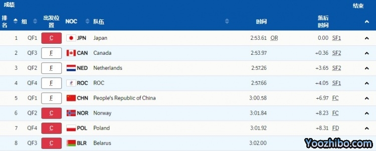 直播车2月12日讯 冬奥会速度滑冰女子团体追逐1/4决赛,中国排名第五无缘晋级半决赛,成绩为3分00秒58。日本2分53秒61排名第一打破奥运纪录,另外三支晋级的队伍是加拿大、荷兰和俄奥队。1/4决赛中成绩最好的4支队伍进入半决赛,第5名和第6名的队伍进入C组决赛,其他两只队伍进入D组决赛。