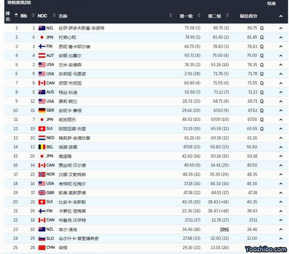 村濑心椛之后出场,她的发挥仍旧非常出色,得到了81.45分,仅次于辛诺特排名第二,而随后出场的荣格再一次出现重大失误,只拿到了13.01分,基本上这个成绩也最终宣告了她无缘决赛。最终,荣格排在30位参赛运动员的第25位。