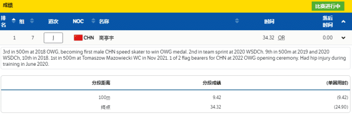 第7组,高亭宇在内道,波兰选手达米安-茹雷克在外道,高亭宇先是内弯道,进入直道的时候已经远超波兰选手,最终高亭宇的成绩是34秒32,新的奥运会纪录诞生,恭喜。