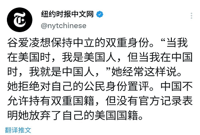 所以“不辟谣也就意味着有可能存在”,这样的说法其实是无稽之谈,要知道的是,当谷爱凌在2019年6月6日宣布自己是中国国籍,为中国队出战的时候,其实她的身份也就已经很明确,那就是中国人,已经放弃了代表美国队出战的权利,因为中国是不允许公民有两个国籍的,这也是常识。