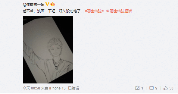 还有体操冠军深夜作画,2月3日大年初三凌晨,全运会、亚运会女子个人全能、平衡木冠军陈一乐就在社交媒体上晒出了自己的作画,她画的就是羽生结弦,非常像,陈一乐配文:“睡不着,浅画一下吧,好久没动笔了。”