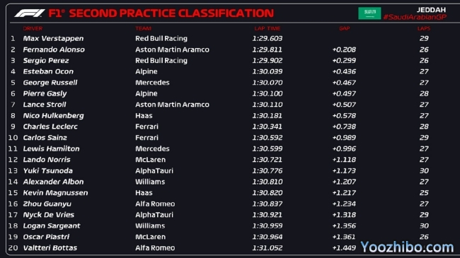 直播车讯 北京时间03月17日,2023年F1沙特大奖赛第2次练习赛结束,红牛车队维斯塔潘依旧第一,并且做出了1:29.603的周五最快单圈,阿斯顿马丁车队阿隆索落后0.208秒位列第二,佩雷兹第三,前三再次被他们三人包揽。