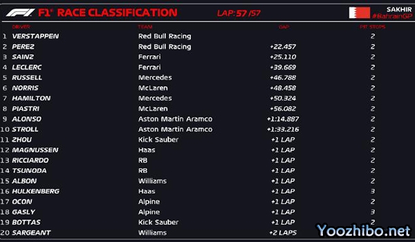 直播车讯 北京时间3月2日,2024赛季F1揭幕站巴林大奖赛今日进行了正赛的争夺。杆位出发的维斯塔潘一路领先,顺利拿下冠军实现开门红,队友佩雷兹获得第二名,塞恩斯和勒克莱尔分别获得第三和第四位,汉密尔顿获得第7,第17位出发的中国车手周冠宇获得第11名,与积分失之交臂。