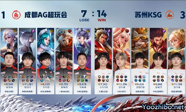 开局苏州KSG选择边开帮助对抗路发育。三分五十,苏州KSG今屿(徐翔宇)哪吒大招锁定戈娅配合队将其击杀,成都AG_钟意(陈家豪)镜及时赶到反杀哪吒。四分五十,钟意(陈家豪)镜先手开团击杀对方张飞,今屿(徐翔宇)哪吒赶到配合击杀对方镜,双方一换一。六分三十,成都AG超玩会击杀掉落单哪吒,随后蓝区处,苏州KSG主动逼团,成都AG超玩会立刻反打,成都AG超玩会一换二。十分三十,今屿(徐翔宇)哪吒绕后大招锁定戈娅配合队友击杀对方三人,并顺势拿到暗影暴君。十二分五十,成都AG超玩会三路外塔全部告破,双方经济差达到5K。十四分四十,下路高地,苏州KSG久酷 (王滔)张飞大招先手开团,配合队友率先击杀对方戈娅,苏州KSG轻语 (谢欣臻)姬小满进场收割拿到三连决胜,团灭成都AG超玩会,随后顺着兵线,击破水晶,拿到本场比赛的胜利!