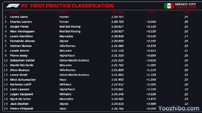 2022年F1墨西哥大奖赛第1次练习赛成绩表: