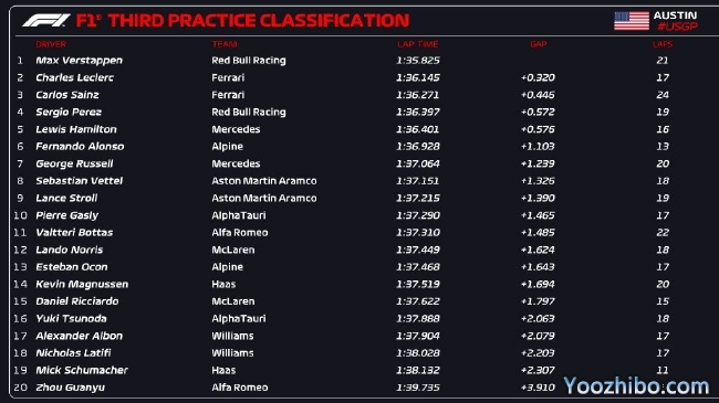 2022年F1美国大奖赛第3次练习赛成绩表: