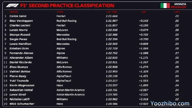 2022年F1意大利大奖赛第2次练习赛成绩表