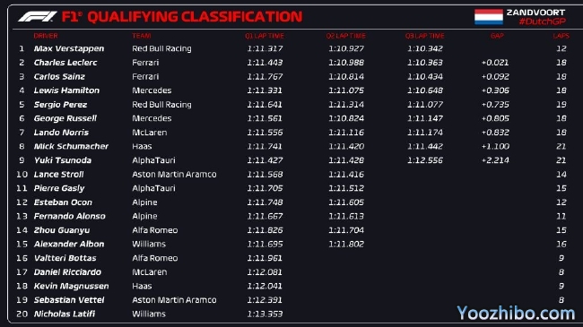 直播车讯 2022年F1荷兰大奖赛排位赛在赞德沃特赛道结束,红牛车队维斯塔潘在主场拿到杆位,这也是他连续两年在主场拿到杆位;法拉利车队勒克莱尔第二,他的队友塞恩斯第三。汉密尔顿、佩雷兹、拉塞尔、诺里斯、米克-舒马赫、角田裕毅、斯托尔分列四至十位。中国车手周冠宇排名第14位。