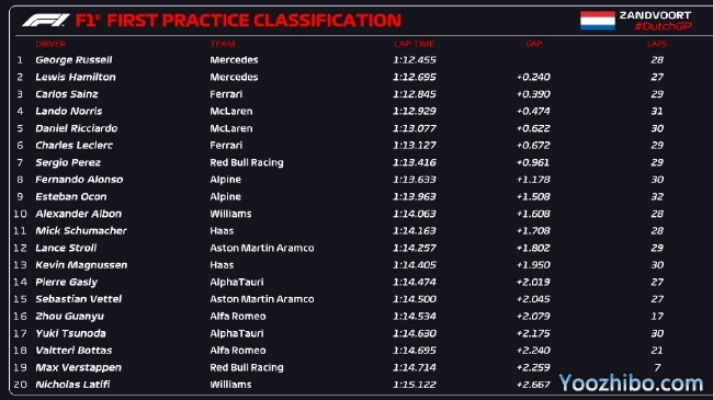 2022年F1荷兰大奖赛第1次练习赛成绩表