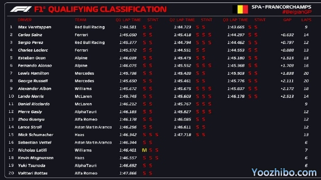 直播车讯 2022年F1比利时大奖赛排位赛在斯帕赛道结束,红牛车队维斯塔潘以超过0.6秒的优势,连续两个赛季在斯帕拿到排位赛第一!法拉利车队塞恩斯第二,维斯塔潘的队友佩雷兹第三。但是由于维斯塔潘被罚后退发车,所以正赛中塞恩斯和佩雷兹将占据头排发车位。