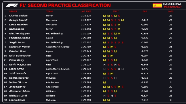 直播车讯 2022年F1西班牙大奖赛第2次练习赛5月20日晚上结束,法拉利车队勒克莱尔以1:19.670的成绩获得二练头名,两位梅赛德斯车手拉塞尔、汉密尔顿名列二三位。塞恩斯第四,维斯塔潘第五,第六至第十位的车手是阿隆索、佩雷兹、维特尔、奥康和米克·舒马赫。
