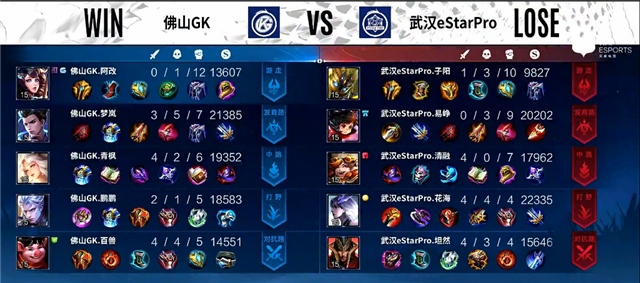 1分钟上路团战,猪八戒拿下一血,双方1换1。1分40秒上路团战,双方1换1。3分钟猪八戒被击杀。3分30秒镜拿下暴君。4分30秒蒙恬推掉上路一塔。5分钟狄仁杰被击杀。5分40秒镜拿下主宰。6分30秒蒙恬被击杀。7分钟镜拿下暴君。10分钟暴君团,武汉eStarPro打出1换2,镜拿下暴君。11分钟上路团战,武汉eStarPro打出1换2。12分30秒李元芳拿下主宰,镜推掉中路一塔。13分钟镜拿下暴君。16分钟镜拿下主宰。17分钟李元芳推掉下路高地塔。18分钟镜拿下暴君。20分钟下路团战,双方1换1。23分30秒嫦娥被击杀,李元芳推掉中路高地塔。26分钟风暴龙王团,佛山GK打出0换2,铠拿下风暴龙王。27分钟佛山GK推掉中上2路高地塔。29分钟河道团战,佛山GK打出0换3。30分钟风暴龙王团,铠抢下风暴龙王,团战佛山GK打出0换2。30分42秒佛山GK推掉水晶拿下本场比赛胜利。