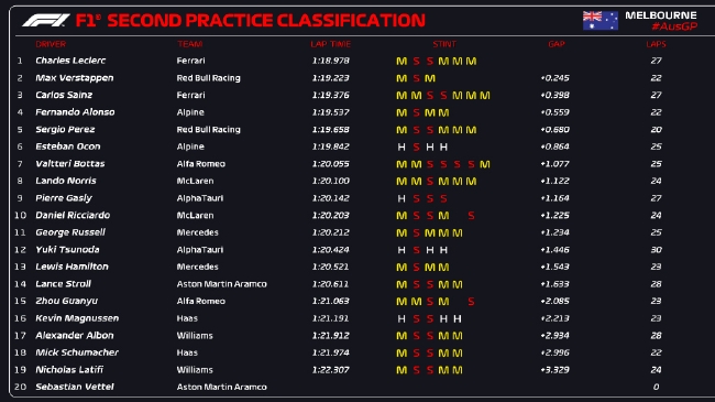 2022F1澳大利亚大奖赛第二次练习赛成绩表