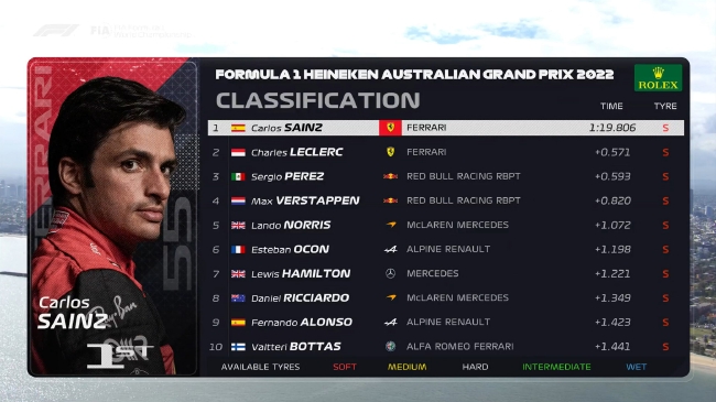直播车讯 :北京时间4月8日下午,2022年F1澳大利亚大奖赛第1次练习赛在墨尔本赛道结束。前四名被法拉利和红牛包揽:塞恩斯1:19.806位列第一,队友勒克莱尔落后0.571秒排名第二;佩雷兹和维斯塔潘分列三四,前四名车手差距在1秒之内。