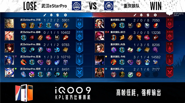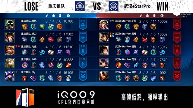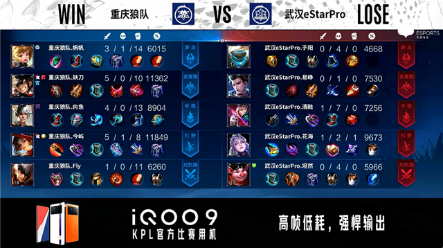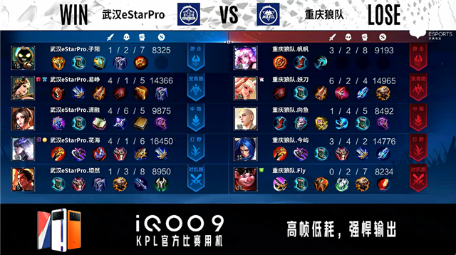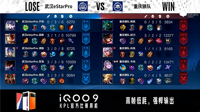 开局武汉eStar边路换线。2分09秒重庆狼队拿下暴君。3分11秒武汉eStar对抗路打出0换2。4分37秒重庆狼队摧毁敌方对抗路外塔。4分59秒重庆狼队露娜发育路单杀刘邦。5分03秒双方对抗路1换1。5分39秒重庆狼队野区击杀刘邦。6分09秒重庆狼队拿下主宰。6分28秒野区团战武汉eStar打出1换2。8分06秒武汉eStar中路击杀墨子。8分10秒重庆狼队拿下暴君。9分10秒重庆狼队摧毁敌方对抗路二塔。9分19秒对抗路团战武汉eStar打出1换2。10分36秒重庆狼队拿下暗影主宰。11分32秒重庆狼队拿下暗影暴君。12分19秒重庆狼队摧毁敌方中路、发育路高地塔。13分48秒武汉eStar高地击杀狂铁。14分26秒主宰处团战武汉eStar打出1换2。14分49秒武汉eStar拿下暗影主宰。15分48秒野区团战重庆狼队打出1换4。16分10秒重庆狼队摧毁敌方水晶拿下比赛。