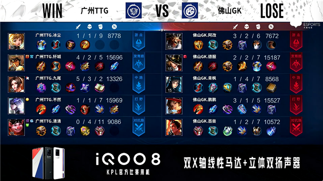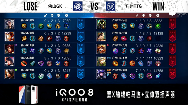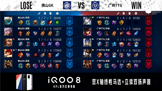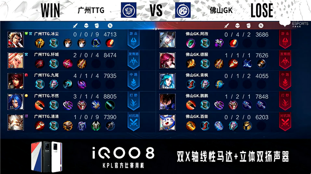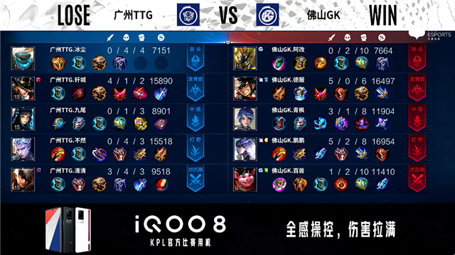 双方常规开局。2分14秒广州TTG主宰处击杀澜拿到一血。4分23秒佛山GK野区击杀橘右京。5分18秒广州TTG对抗路击杀东皇太一。6分06秒广州TTG野区击杀东皇太一。6分37秒广州TTG拿下暴君。7分28秒广州TTG摧毁敌方对抗路二塔并在团战中打出1换2。11分08秒中路团战广州TTG打出0换5。11分32秒广州TTG摧毁敌方发育路高地塔。11分38秒广州TTG摧毁敌方水晶拿下比赛。