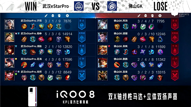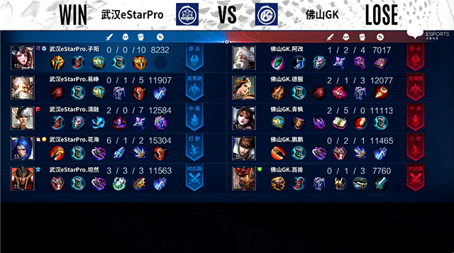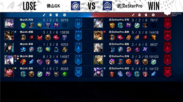 双方常规开局。4分38秒武汉eStar拿下主宰。4分47秒佛山GK拿下暴君。5分29秒中路团战双方1换1,佛山GK拿到一血。7分59秒中路团战双方1换1。9分04秒武汉eStar拿下主宰,佛山GK拿下暴君。9分25秒主宰处团战佛山GK打出1换2,并摧毁敌方中路外塔。10分22秒主宰处团战武汉eStar打出3换4。11分43秒武汉eStar拿下暗影主宰,佛山GK拿下暗影暴君。12分27秒武汉eStar摧毁敌方发育路二塔。13分15秒武汉eStar摧毁敌方中路外塔。14分31秒对抗路团战武汉eStar打出1换2。15分56秒武汉eStar拿下暗影主宰。16分32秒武汉eStar拿下暗影暴君。17分07秒武汉eStar摧毁敌方中路二塔。17分30秒武汉eStar摧毁敌方对抗路高地塔。18分01秒佛山GK中路击杀虞姬。20分23秒龙王处团战武汉eStar打出2换4。20分49秒武汉eStar团灭对手摧毁水晶拿下比赛。