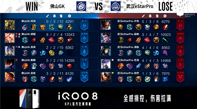 开局武汉eStar入侵野区反掉一组野怪。2分15秒佛山GK暴君处打出0换2。2分30秒佛山GK拿下暴君。4分05秒佛山GK发育路击杀姜子牙。5分14秒武汉eStar拿下主宰。7分08秒中路团战双方3换3。8分10秒野区团战佛山GK打出3换5,镜拿到四连超凡。10分25秒佛山GK拿下暗影暴君。11分57秒佛山GK拿下暗影主宰。12分56秒佛山GK摧毁敌方对抗路二塔。14分03秒佛山GK摧毁敌方中路二塔。14分36秒佛山GK拿下暗影暴君。15分50秒佛山GK摧毁敌方发育路二塔,武汉eStar摧毁敌方对抗路二塔。16分12秒佛山GK拿下暗影主宰。16分46秒野区团战武汉eStar打出1换3。17分18秒武汉eStar摧毁敌方中路二塔。17分35秒野区团战武汉eStar打出1换2。19分02秒野区团战武汉eStar打出2换5。19分52秒武汉eStar摧毁敌方水晶拿下比赛。