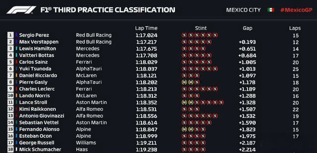 最终,佩雷兹以1:17.024的成绩排名第一,维斯塔潘第二落后0.193秒,汉密尔顿第三落后0.651秒,博塔斯第四,塞恩斯第五。第六至第十位分别是角田裕毅、里卡多、加斯利、勒克莱尔以及诺里斯。