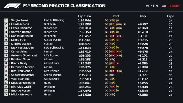 最终,佩雷兹凭借1分34秒946的成绩占据榜首,汉密尔顿一度做出了更快的单圈成绩,但因为超出赛道限制而被取消。诺里斯落后0.257秒排名第二,汉密尔顿和博塔斯分列三四。因为交通拥堵的原因,维斯塔潘并未做出理想的单圈成绩。