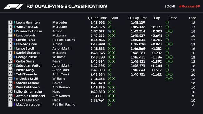 Q2最终结束,汉密尔顿再次刷新最快圈速,以1:45.129的成绩排名第一,博塔斯第二,落后0.177秒,阿隆索第三,落后0.385秒;塞恩斯与拉塞尔在最后时刻晋级;加斯利在最后的计时圈出现失误,最后淘汰的五位车手是维特尔、加斯利、角田裕毅、拉提菲和勒克莱尔。