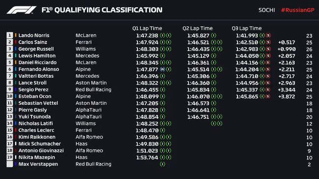最终Q3停表,诺里斯凭借自己出色的发挥,以1:41.993的成绩拿下生涯首个杆位!塞恩斯第二,落后0.517秒,拉塞尔又一次在雨天中表现出色,最终排在第三。汉密尔顿在最后的计时圈中出现失误,最终只排在第四,里卡多第五。第六至第十位的车手是阿隆索、博塔斯、斯托尔、佩雷兹和奥康。