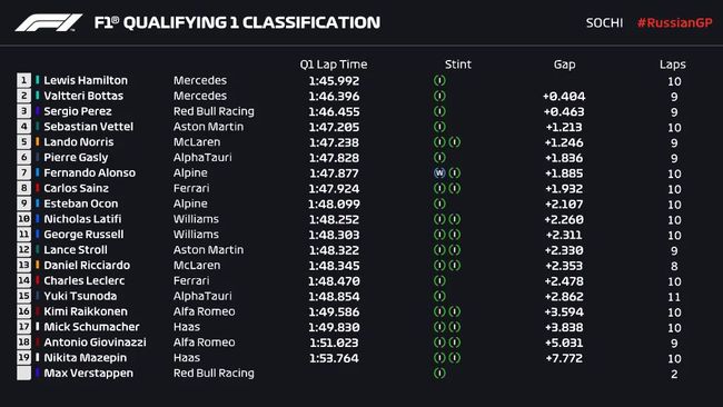 Q1最终结束,最后时刻汉密尔顿超越博塔斯,凭借的1:45.992成绩排在第一,博塔斯第二,佩雷兹第三。威廉姆斯双车晋级,拉塞尔凭借最后一个计时圈的成绩上升到第11。最后Q1淘汰的5位车手是莱科宁、米克·舒马赫、吉奥维纳兹、马泽平、维斯塔潘。