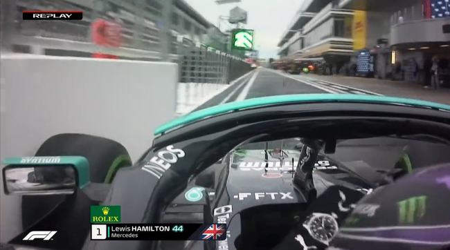 汉密尔顿在进入维修区入口时撞上护墙,前翼受损,在维修区中更换了前翼。