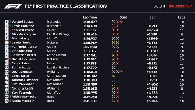 加斯利是俄罗斯一练测试里程最长的车手,共完成13圈,大部分车手完成了10圈测试。重返赛场的罗密欧车手基米莱科宁圈速排名第16位。