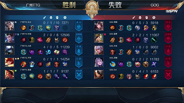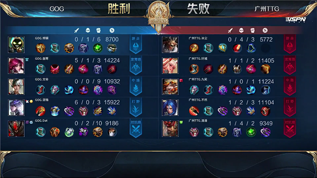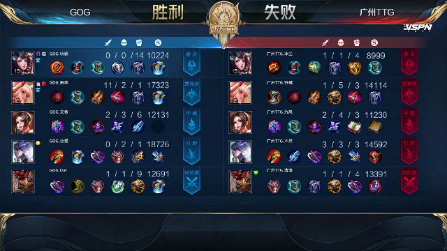 1分55秒上路团,广州TTG打出0换2。2分21秒广州TTG拿下暴君,双方1换1。4分39秒GOG拆到广州TTG下路一塔,4分53秒中路团GOG击杀不知火舞。5分52秒GOG击杀公孙离,拆掉广州TTG上路一塔。6分54秒团战双方1换1,8分50秒中路团双方1换1。9分15秒GOG击杀广州TTG公孙离,10分11秒GOG拿下暗影暴君,10分27秒广州TTG拿下暗影主宰。11分02秒团战GOG打出0换2拆掉广州TTG中路二塔。14分42秒GOG拿下暗影暴君,15分48秒广州TTG拆掉GOG下路二塔。16分钟上路团双方打出2换2,17分49秒GOG拆掉广州TTG下路高地。20分35秒团战双方1换1,21分54秒GOG击杀广州TTG公孙离,拿下风暴龙王。22分26秒GOG拆掉广州TTG上路高地,一波拆掉其水晶拿下胜利!
