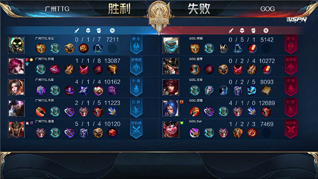 47秒GOG入侵广州TTG野区,广州TTG击杀猪八戒拿下一血。2分30秒团战广州TTG打出0换2,4分41秒广州TTG拆掉GOG下路一塔并击杀盾山。6分34秒团战GOG打出1换4,橘右京拿下四杀。9分54秒广州TTG拿下暴君,10分42秒GOG拿下暗影暴君,广州TTG拿下暗影主宰。14分59秒团战广州TTG打出0换4,15分10秒广州TTG连拆GOG中路三塔,15分46秒广州TTG带领兵线一波拆掉GOG水晶。