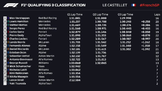 2021F1法国站排位赛成绩: