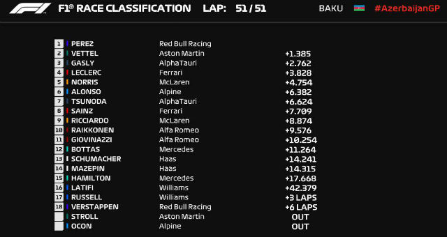 最后一圈,勒克莱尔超越加斯利上升到了第三位,但是加斯利很快完成了反超。最终佩雷兹率先冲过终点,拿下了自己在红牛的首个分站冠军,维特尔获得第二名,创造了自己本赛季迄今为止的最佳成绩。加斯利获得第三名登上了领奖台,他和维特尔在本赛季都是首次登上领奖台。接下来依次是勒克莱尔、诺里斯和阿隆索。
