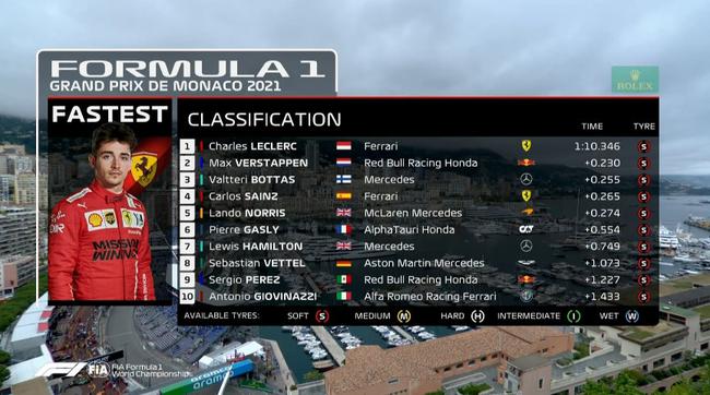 直播车讯 北京时间5月22日晚,2021F1摩纳哥大奖赛排位赛结束。经过1个多小时的比拼,尽管因为撞墙引发红旗导致排位赛提前结束,但法拉利车手勒克莱尔还是以1分10秒346的成绩,在主场拿下了赛季首个杆位,维斯塔潘落后0.230秒排名第二,博塔斯落后0.255秒排名第三。P4-P10分别为:塞恩斯、诺里斯、加斯利、汉密尔顿、维特尔、佩雷兹和吉奥维纳兹。正赛将在北京时间23日晚21点开始。
