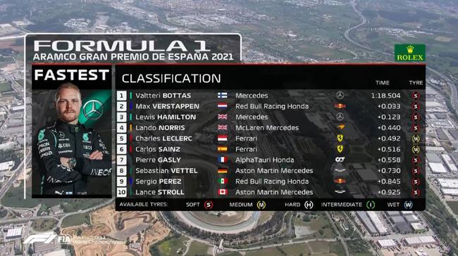 直播车讯 北京时间5月7日傍晚,2021F1西班牙大奖赛第一次自由练习赛在加泰罗尼亚赛道结束。经过一个多小时的争夺,梅奔车手博塔斯以1分18秒504的成绩排名第一,红牛车手维斯塔潘落后0.033秒排名第二,梅奔车手汉密尔顿落后0.123秒排名第三。P4-P10分别为诺里斯、勒克莱尔、塞恩斯、加斯利、维特尔、佩雷兹、斯特罗尔。第二次自由练习赛将于北京时间21点开始。