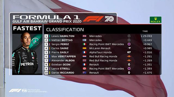 直播车讯:北京时间11月27日,结束了F1巴林大奖赛第一次练习赛汉密尔顿以1:29.033排名第一,博塔斯落后0.449秒排名第二,佩雷兹落后0.967秒排名第三,塞恩斯第四,加斯利第五。六到十名的分别是维斯塔潘、阿尔本、奥康、斯托尔、里卡多。二练将于北京时间23点开始。