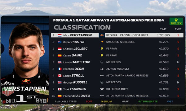直播车讯 北京时间06月28日晚,2024F1奥地利大奖赛, 一练最终成绩:
