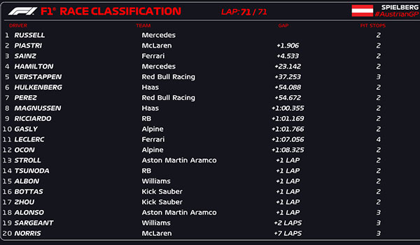 直播车讯 北京时间06月30日,F1奥地利站正赛结束,拉塞尔捡漏夺冠!维斯塔潘诺里斯相撞双双痛失冠军,周冠宇第17。