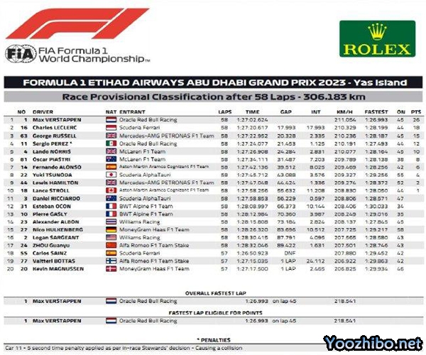 最终58圈战罢,维斯塔潘全程领跑夺得冠军,拉塞尔冲线成绩与佩雷兹差3.8秒,因此勒克莱尔第二,拉塞尔第三,佩雷兹第四。梅奔力压法拉利获得年度车队亚军。