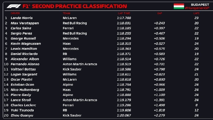 直播车讯 北京时间7月19日,F1匈牙利站二练结束,诺里斯全场最快,维斯塔潘、赛恩斯位居二、三,勒克莱尔上墙退赛,周冠宇遭佩雷兹阻挡后轮胎损坏,无有效软胎成绩,位居垫底。