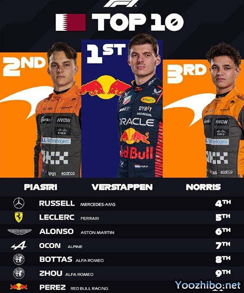 直播车讯 北京时间10月09日,2023年F1卡塔尔大奖赛正式比赛结束,红牛车队维斯塔潘完成Pole-To-Win,收获赛季第14场胜利!迈凯伦车队双车登台,皮亚斯特里和诺里斯包揽亚军和季军!拉塞尔、勒克莱尔、阿隆索、奥康、博塔斯、周冠宇、佩雷兹分列四至十位。