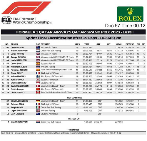 2023F1卡塔尔大奖赛冲刺赛成绩表: