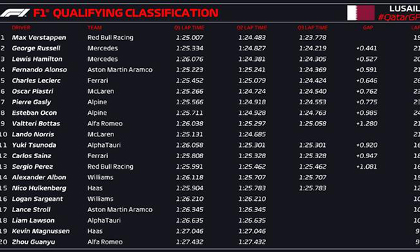 2023年F1卡塔尔大奖赛排位赛成绩表:
