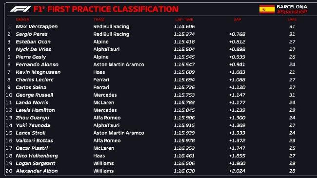 直播车讯 2023年F1西班牙大奖赛第1次练习赛在巴塞罗那赛道结束,红牛车队维斯塔潘以1:14.606排名第一,他的队友佩雷兹落后0.768秒排名第二,Alpine车队奥康落后0.812秒排名第三。德弗里斯、加斯利、阿隆索,马格努森,勒克莱尔,塞恩斯,拉塞尔分列四至十位。中国车手周冠宇圈速第13位。