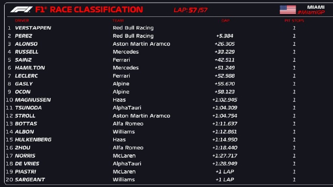 直播车讯 2023年F1迈阿密大奖赛正式比赛结束,凭借超强的保胎表现,第九位发车的维斯塔潘最终率先冲线,收获本赛季个人的第三个分站冠军,同时他也连续两年在迈阿密大奖赛夺冠!他的队友佩雷兹亚军,红牛车队再次一二带回!阿斯顿马丁车队阿隆索季军,这也是他本赛季第四次登上领奖台。