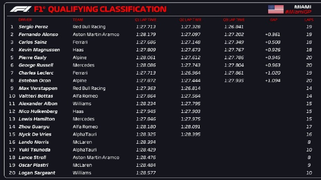 直播车讯 北京时间05月07日,2023年F1迈阿密大奖赛排位赛结束,红牛车队佩雷兹夺得杆位,阿斯顿马丁车队阿隆索第二,法拉利车队塞恩斯排名第三。马格努森第四,加斯利第五,拉塞尔第六,勒克莱尔第七,奥康第八,维斯塔潘第九,博塔斯第十。