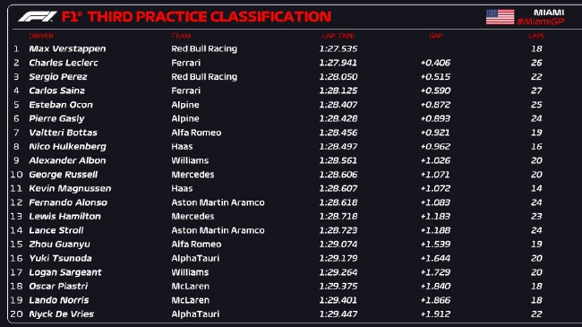 直播车讯 2023年F1迈阿密大奖赛第3次练习赛结束,红牛车队维斯塔潘以1:27.535排名第一,法拉利车队勒克莱尔落后0.406秒排名第二,另一位红牛车手佩雷兹落后0.515秒排名第三。塞恩斯和奥康分列四五,排名六至十位的车手分别是加斯利、博塔斯、霍肯伯格、阿尔本、拉塞尔。