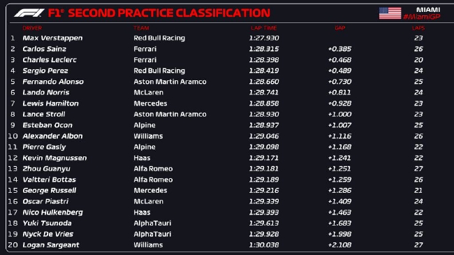 直播车讯 2023年F1迈阿密大奖赛第2次练习赛结束,红牛车队维斯塔潘以1:27.930排名第一,法拉利车队塞恩斯落后0.385秒排名第二,他的队友勒克莱尔落后0.468秒排名第三。佩雷兹和阿隆索分列四五,排名六至十位的车手分别是诺里斯、汉密尔顿、斯托尔、奥康、阿尔本。